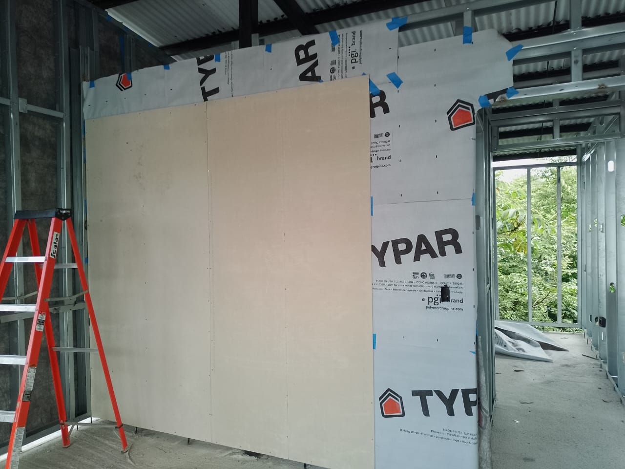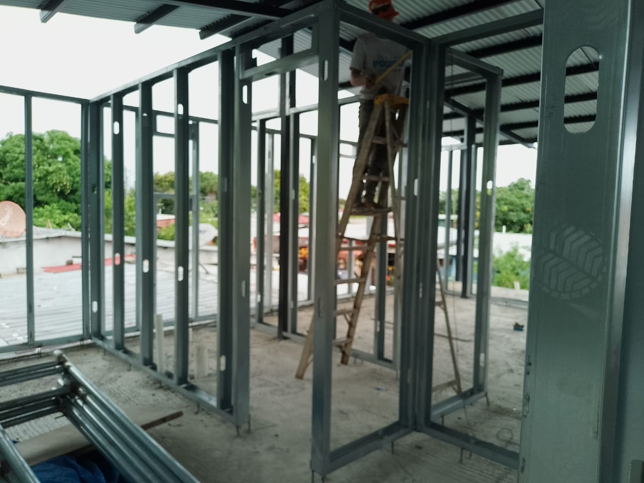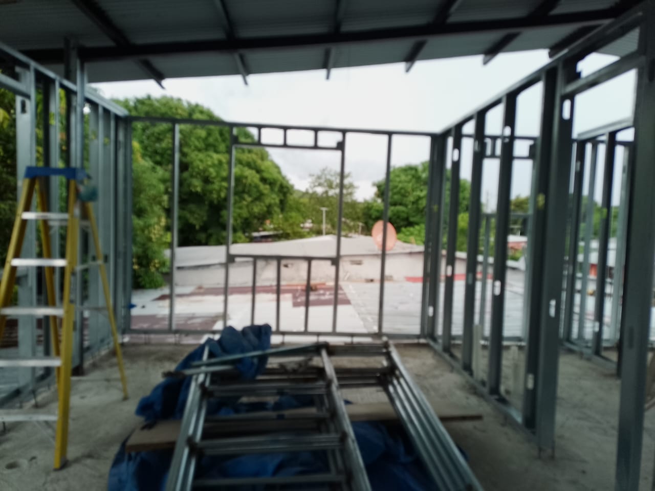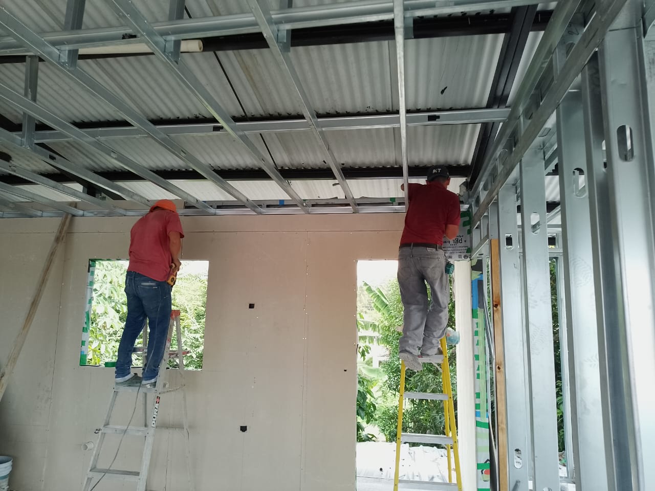 El segundo piso se realizó con materiales livianos como Plycem (somos instaladores autorizados del producto) y se hicieron 4 cuartos y 2 baños, son sala comedor y cocina con una isla.